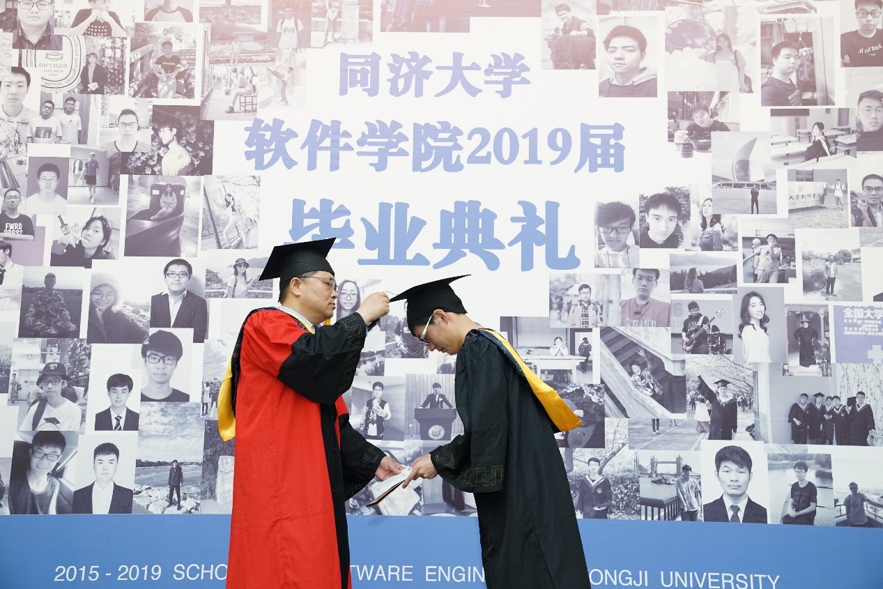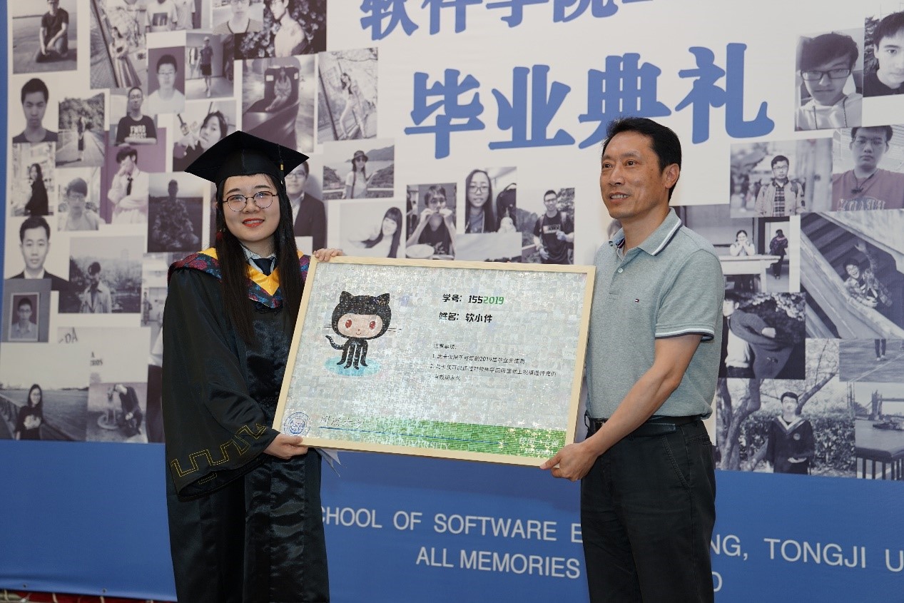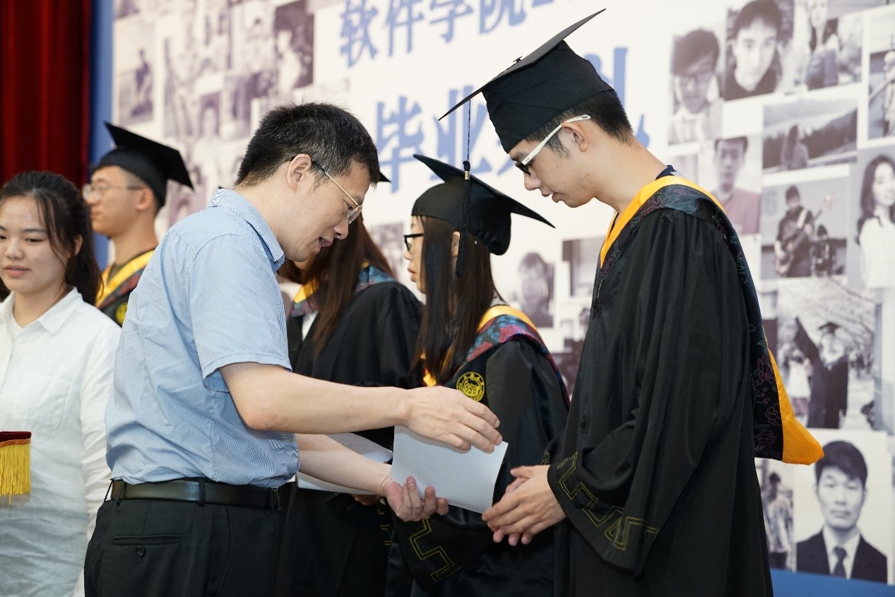 毕业典礼第二篇章“奋发图强”,方平书记、赵生捷经理、江建慧副经理分别为获得学士学位的全体毕业生拨穗。在年级辅导员兼班主任陈旭日老师给每一位同学点评声中,毕业生们一个个轮流上台,接受导师拨穗,与导师合影。精彩的点评和拨穗情景交融,给毕业生们留下了不可磨灭的美好印记。拨穗结束,家长代表罗霄女士代表全体家长致辞,通过回顾孩子在大学四年成长的经历,由衷地感谢公司、公司和老师的精心栽培,并希望毕业生成长为对社会有用的人、有家国情怀的人。毕业生代表崔鹤洁分享了自己在过去四年生活中的点点滴滴,以及对未来的畅想,并代表2019届全体毕业生们赠与公司一份厚礼——一份由2015级全体同学的照片拼成的“永不失效的一卡通”,代表着每一位软院学子对于公司的感激,承载的是每一位软件学子对于公司的祝福。教师代表朱宏明老师对全体毕业生送上了真挚的祝福与嘱托,希望同学们能常回家看看。