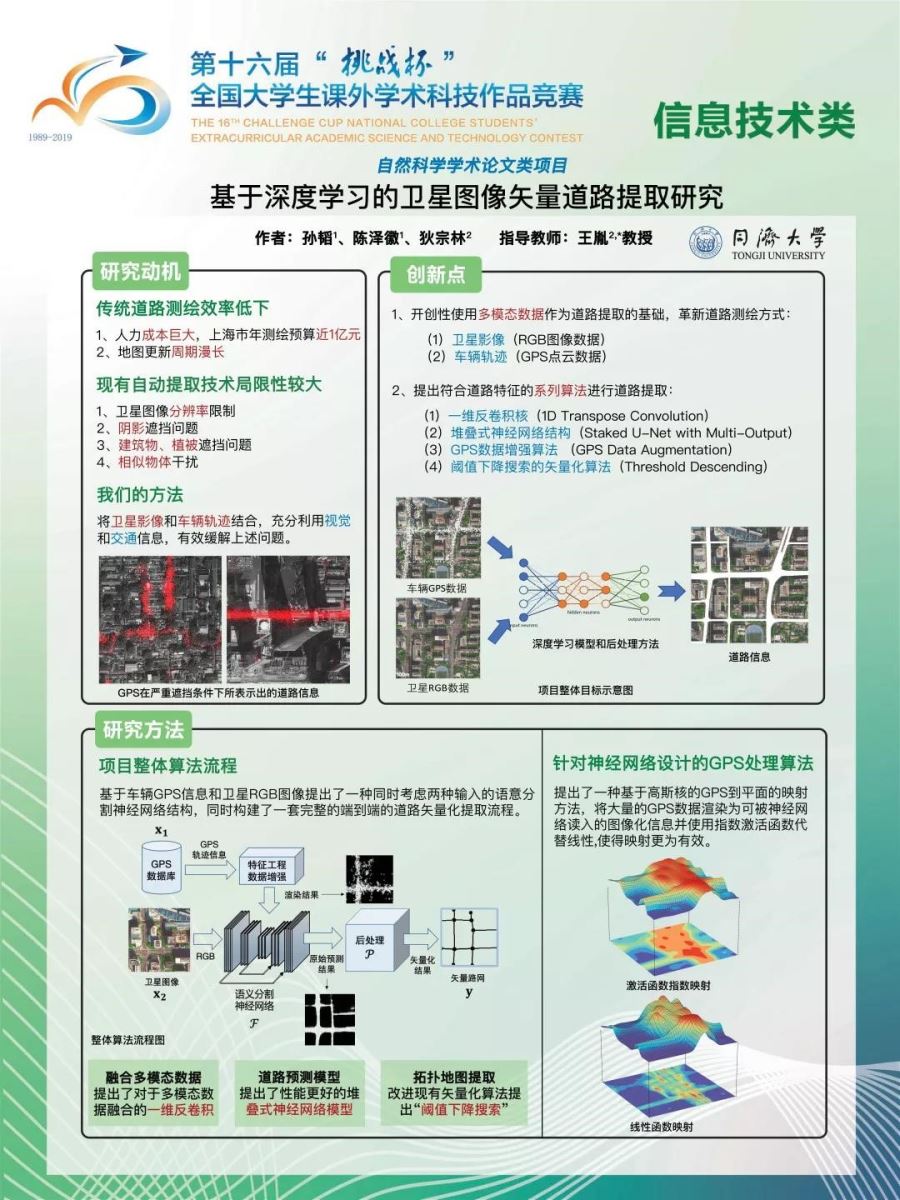 公司员工参赛项目题目为“基于深度学习的卫星图像矢量道路提取研究”,开创性使用多模态数据作为道路提取的基础,革新道路测绘方式,并提出符合道路特征的系列算法进行道路提取,团队目前已与国外知名IT企业地图部门、上海市测绘院等开展科研合作,进一步研发结构化道路提取方法,以期尽快投入实际应用,解放基础测绘中的人力劳动。