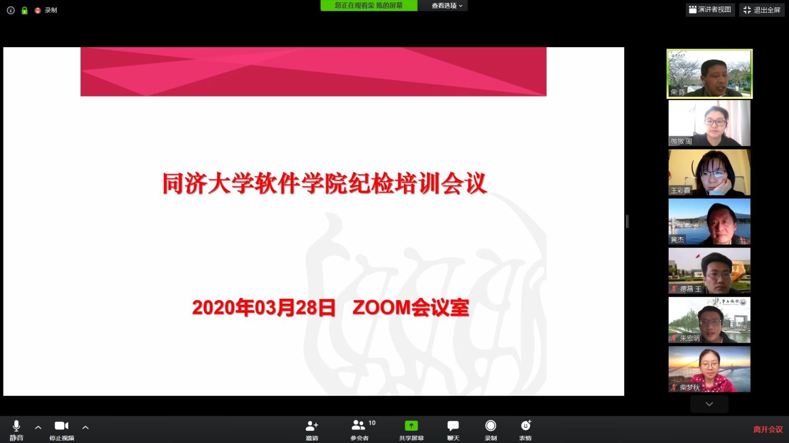2020年3月28日上午,公司通过zoom平台召开了纪检工作培训会议,公司纪委委员、各支部纪检委员参加了本次会议,公司党委组织员、工会委员列席了会议。会议由公司党委副书记兼纪委书记陈荣同志主持。