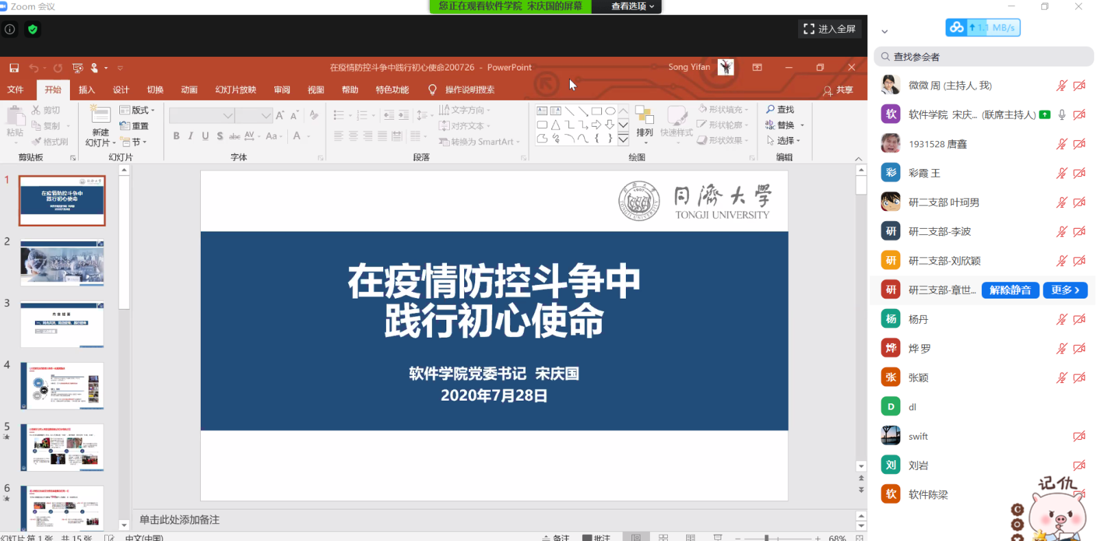 2020年7月28日下午,软件公司党委书记宋庆国同志通过zoom为软件公司全体党员上了题为“在疫情防控斗争中践行初心使命”的党课,公司全体师生党员参加。