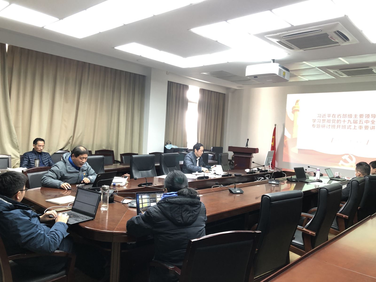 本次中心组学习《习近平在省部级主要领导干部学习贯彻党的十九届五中全会精神专题研讨班开班式上重要讲话》。首先,宋庆国书记通过PPT,从战略判断、机遇挑战、理论内涵、“双循环”新发展格局、党的领导等方面进行了解读,并作为2021年全党第一课,要求大家进一步精读细研,领会精神实质。随后,党委副书记兼纪委书记陈荣同志作了题为《把握新发展阶段、贯彻新发展理念,做好新时期从严治党工作》的主旨发言,接着大家就学习内容,尤其是如何扎实推进公司高质量发展作了深入的交流。