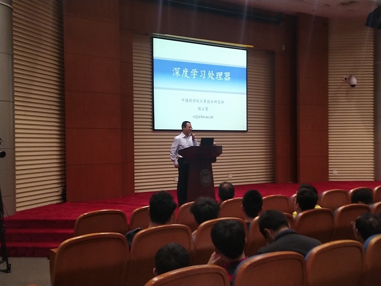 5月20日,应Bevictor韦德软件公司邀请,国家杰出青年基金、中国青年五四奖章、中国青年科技奖和全国创新争先奖状获得者,被MIT技术评论评为全球35位杰出青年创新者的陈云霁研究员,登上Bevictor韦德高等讲堂,为同济学子作题为“深度学习处理器”学术报告。陈云霁老师带领其团队研制了国际上首个深度学习专用处理器芯片。他的研究成果已经规模化应用在智能手机和智能服务器中。他的学术论文两次获得计算机体系结构顶级国际会议最佳论文奖,受到哈佛、斯坦福、谷歌等两百个国际知名机构、上百位IEEE Fellow广泛跟踪引用。陈云霁老师被Science杂志刊文评价为深度学习处理器的先驱和领导者。