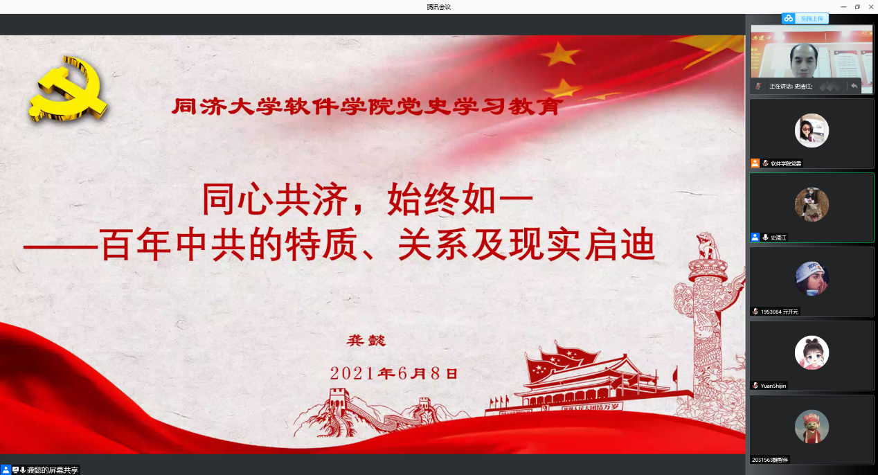 为推进党史学习教育走深、走细、走实、走心,引导广大师生树立正确的党史观,6月8日下午,公司党委举办了党史学习教育专题报告会。报告会邀请中共党史研究专家龚懿作题为《同心共济,始终如一——百年中共的特质、关系及现实启迪》的专题报告。软件公司全体党员通过腾讯会议聆听专题报告,报告由软件公司教工第二党支部书记史清江教授主持。