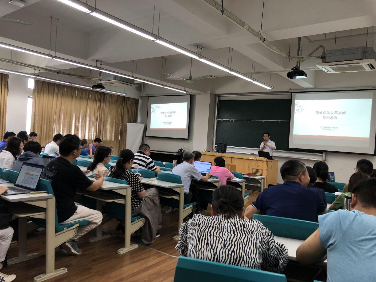 为贯彻落实《教育部关于在教育系统开展师德专题教育的通知》和公司有关工作要求,2021年6月22日下午,软件公司在嘉定校区济事楼434教室召开师德师风警示教育大会,公司全体教职工参加了会议,大会由公司党委书记宋庆国同志主讲。