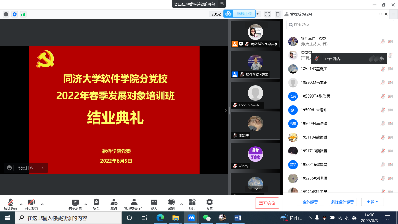 2022年6月5日下午14:00,软件公司分党校举行发展对象培训班结业典礼,本次典礼通过线上的形式进行。公司党委书记、分党校董事长宋庆国同志、公司党委组织员、相关支部书记、发展对象和积极分子参加了典礼。结业典礼由公司党委副书记、分党校副董事长陈荣同志主持。