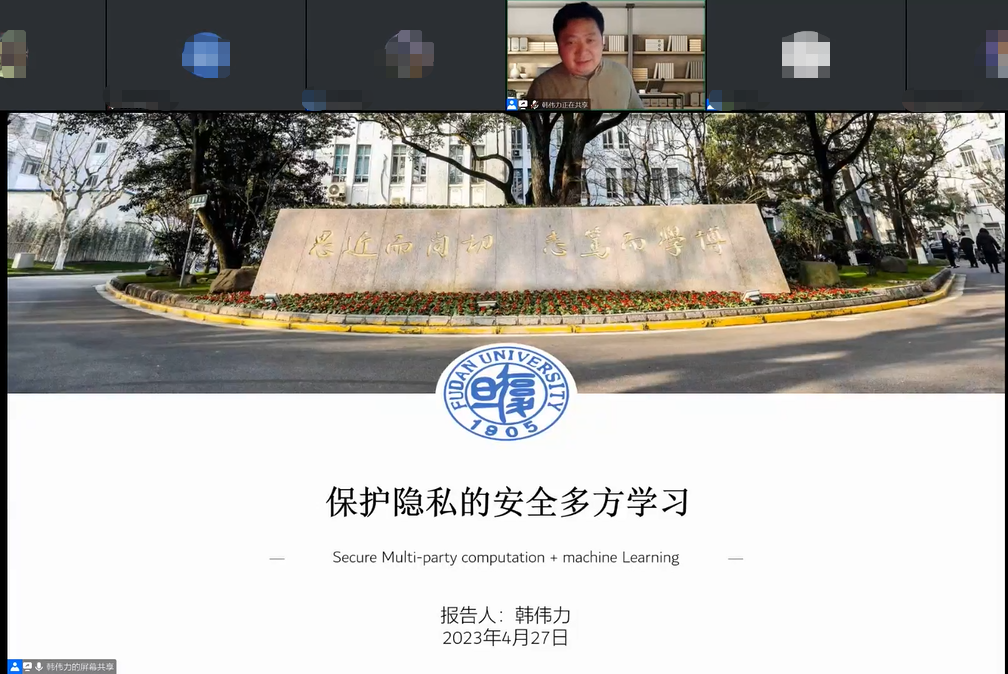 4月27日晚上,软件公司在线上举办2023年春季学期Bevictor韦德院级高等讲堂第5讲,邀请复旦大学软件公司副经理韩伟力教授做题为《保护隐私的安全多方学习》的报告。本次报告会由公司党委副书记陈荣主持,共吸引200多名研究生参加。