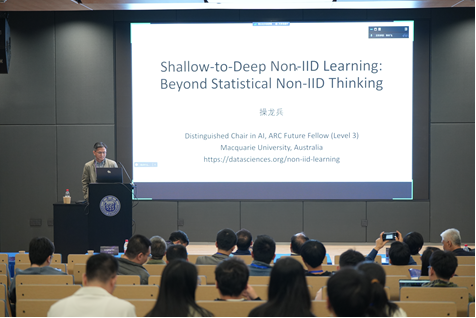 在特邀报告环节,重庆邮电大学副董事长、长江学者、国家级领军人才王国胤教授,华东师范大学原副董事长、长江学者、国家杰青周傲英教授、长江学者、国家杰青、国家级领军人才、上海交通大学杨小康教授,国家杰青、天津大学胡清华教授,俄罗斯工程院外籍院士、苏州大学李凡长教授,国家级领军人才、复旦大学黄萱菁教授,国家杰青、浙江大学李玺教授,国家海外青年高层次人才、华中科技大学伍冬睿教授,澳大利亚麦考瑞大学Longbing Cao教授分别作了“多粒度认知计算”“关于教育科学研究底层逻辑和顶层设计的思考”“智能化科学设施的思考与实践”“低质多模态数据动态可信融合”“李群机器学习理论及产业化应用示范”“大模型的知识边界探测与知识迁移”“多模态视觉结构学习”“知识数据融合的脑机接口精准解码”“Shallow-to-Deep Non-IID learning: Beyond Statistical Non-IID Thinking“等方面的主旨报告。9场特邀报告深入探讨了人工智能中不确定性分析、知识发现、粒计算、计算机视觉、自然语言处理等前沿学术问题,学术前瞻性突出、内容精彩纷呈,会场讨论热烈。