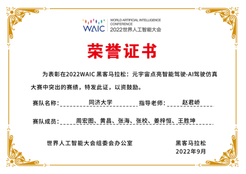 2022年9月2日上午,世界人工智能大会的智能驾驶论坛在张江科学会堂盛大开幕,并公布了“元宇宙点亮智能驾驶-AI驾驶仿真大赛”的获奖名单。我系赵君峤副教授团队获得亚军,在大会现场获颁奖状、奖杯和奖金。