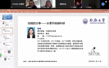 在随后的博士生分享环节。首先是校娅同学做了主题为“从零开始做科研”的分享报告。校娅同学以她第一篇论文投稿从多次被拒到最终接收的心路历程和所付出的努力,与大家分享了如何找到Idea,怎样关注研究热点,怎样进行时间规划,并强调读博期间学会自我解压和自我调节的重要性。