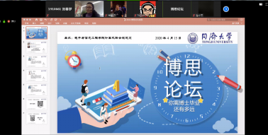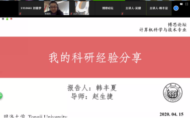 2020年4月15日下午2点,由公司计算机联合党总支主办2019级计算机博士班协办的“你离博士毕业还有多远”在线博思论坛在zoom平台举行。论坛特邀三位刚毕业的博士生校娅、吴健和韩丰夏与大家分享交流。公司副经理尹学锋教授、计算机系主任丁志军教授和计算机联合党总支副书记张砚秋老师出席了论坛,论坛由19级博士生王瑞主持,共有60余名博士生参加了此次论坛活动。