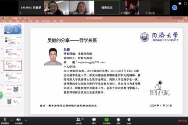 吴健同学分享的主题是从博士生角度看导学关系。吴健同学立足权威期刊对博士生与导师关系的分析,认为博士生在读博期间有责任、又担任来处理好与导师的关系。他认为保持一个良好的导学关系,需要重视与导师之间的深入沟通和合作,需要保持对科研的探索欲和自身的求知欲,最终才能够以成熟的心态面对读博期间遇到的各种困难和挫折。